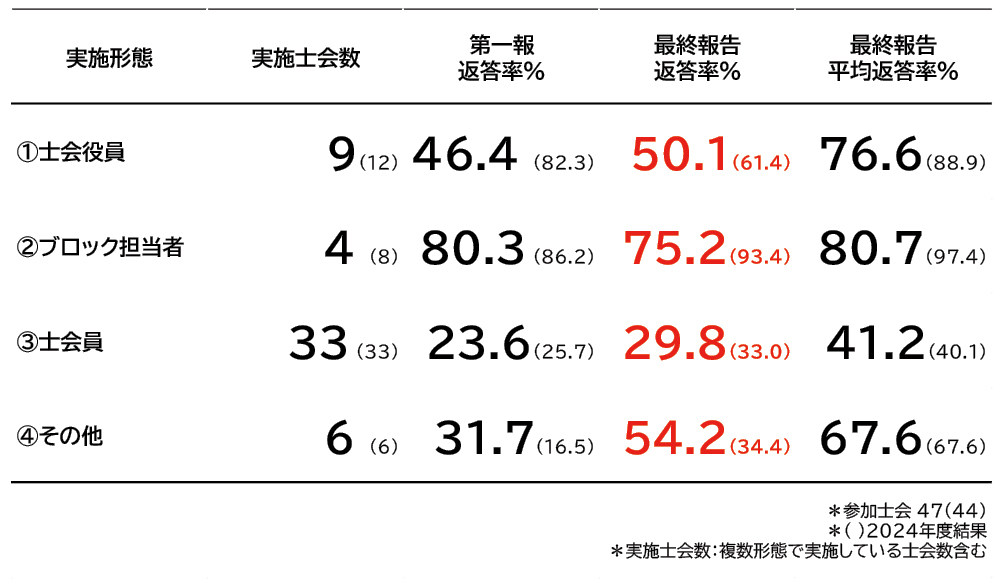 2025年度のシミュレーション訓練では、安否確認率や返信率の向上が複数の士会で確認され、継続的な訓練の成果が表れました(表1)。
